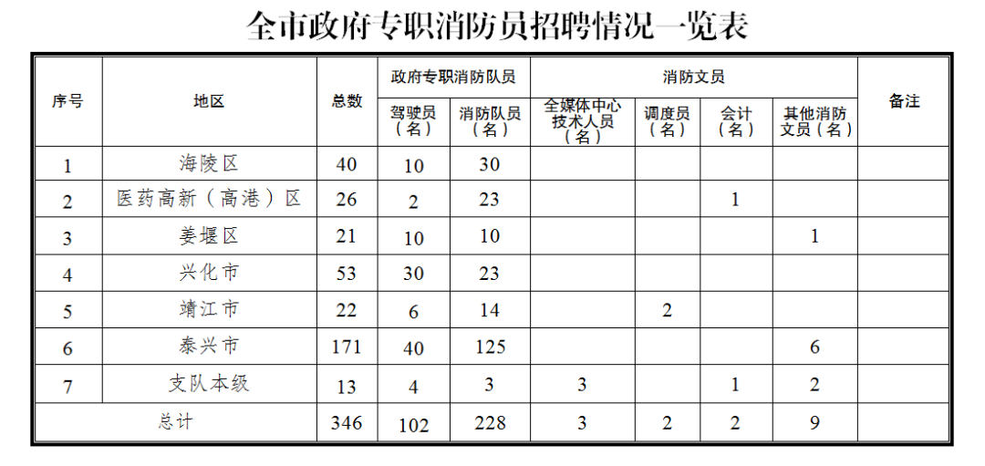 為更好護航泰州市社會經濟發展,不斷提升綜合消防救援能力,根據各地消防救援隊伍建設實際,泰州市消防救援支隊面向社會公開招聘346名政府專職消防員(附表1)。現將有關事項公告如下: